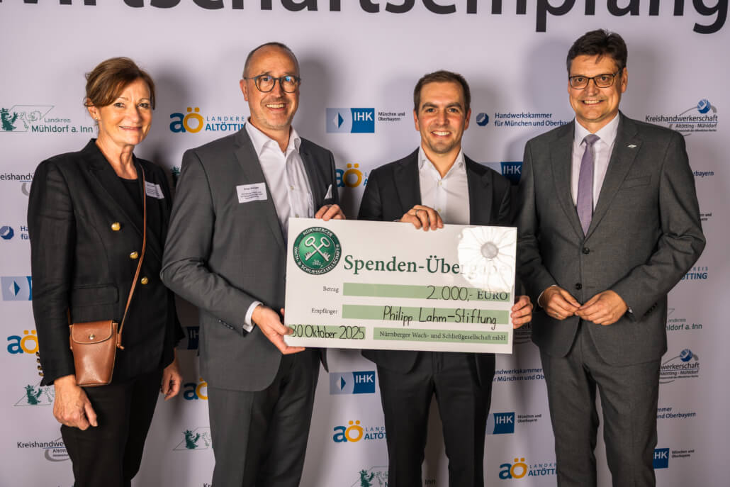 Im Rahmen des Wirtschaftsempfangs der Landkreise Mühldorf und Altötting im Haus der Kultur in Waldkraiburg überreichten am 30.10.2025 NWS Geschäftsführer Ernst Steuger (2.v.l.) und Ellen Heutling (l.), Leiterin Marketing/Vertrieb, im Beisein von Gastgeber Max Heimerl (r.), Landrat des Landkreis Mühldorf a. Inn, den NWS Spendenscheck an Philipp Lahm (2.v.r.), Vorstandsvorsitzender der Philipp Lahm-Stiftung.