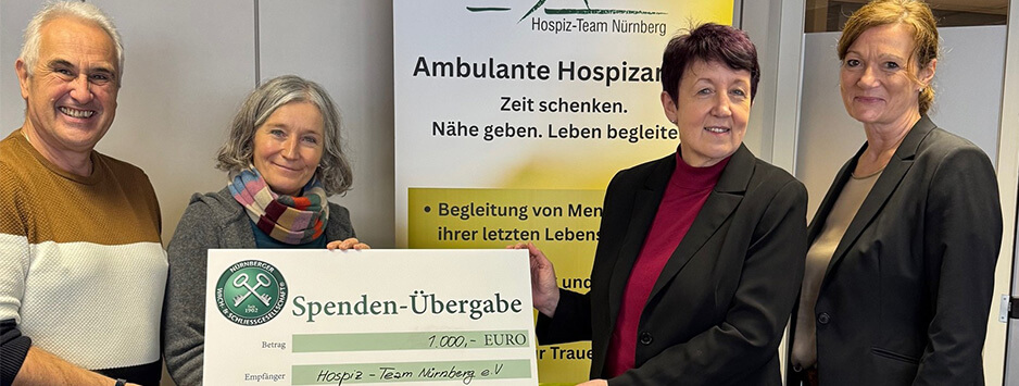 Wir freuen uns, dass Hospiz-Team Nürnberg mit einer Spende von 1.000 Euro in ihrem Engagement zu unterstützen. Ellen Heutling, Leiterin Marketing/Vertrieb der Nürnberger Wach- und Schließgesellschaft, und Ursula Leisten, Vertriebsmitarbeiterin der Nürnberger Wach- und Schließgesellschaft, überreichen den NWS Spendenscheck an Diakon Dirk Münch, 1. Vorsitzender des Hospiz-Team Nürnberg, und Sabine Wittmann, Leitende Koordinatorin